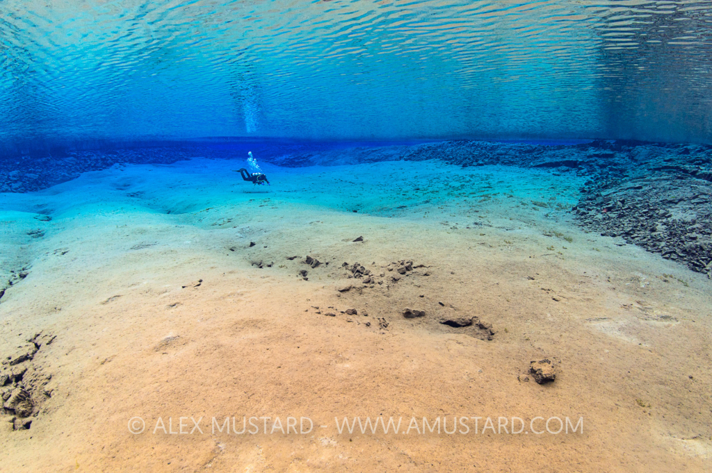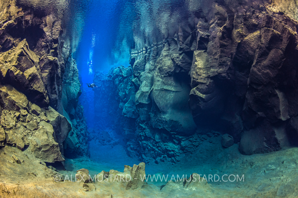 Alex says “The wow moment at Silfra comes right at the start. It is the process of dipping your mask beneath the surface that blows your mind.“Silver” canyon gets its name because the dark waters, shaded by the narrow walls of the canyon, conspire with the smooth surface to reflect the clouds above. The mirror-like surface reveals very little of what lies beneath. It’s only at the moment of submergence that you pass through the looking glass. Only then is the scale of the place revealed, and because you can see so much more than you could from above the surface, you get the feeling that the water is even clearer than the air. The visuals, combined with the cold, scramble the brain – this is a place to be fully prepared before the dive, so you make the most of the opportunities. The workshop is focused on Silfra, and we’ve even scheduled a night dive with off-camera lighting, but I plan to visit other (less famous, but equally photogenic) sites sites once everyone has bagged their Silfra shots. Diving will be in groups of 3 with a guide, who will also act as a model. The group size is limited to 12, and I am happy for either photographers as well as non-photographers (should you want to bring your own model) to fill the spaces on this trip.”