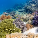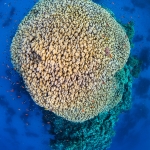 - A top down view of a coral pinnacle, or bommie. made of dome coral (Porites nodifera) and surrounded by fish, including scalefin anthias (Pseudanthias squamipinnis), with diver (Jesper Morch). Fury Shoal, Egypt. Red Sea.