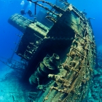 - A pair of divers explore the wreck of the Giannis D, Abu Nuhas reef. Strait of Gubal, Red Sea. Egypt.