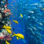 - The vertical reef wall at Shark Reef, Ras Mohammed, with anthias (scalefin anthias: Pseudanthias squamipinnis) and soft corals (Dendronephthya spp.), yellowsaddle goatfish (Parupeneus cyclostomus) and a school of bohar snappers (two-spot snappers: Lutjanus bohar) in a spawning aggregation.Ras Mohammed Marine Park, Sinai, Egypt. Red Sea.