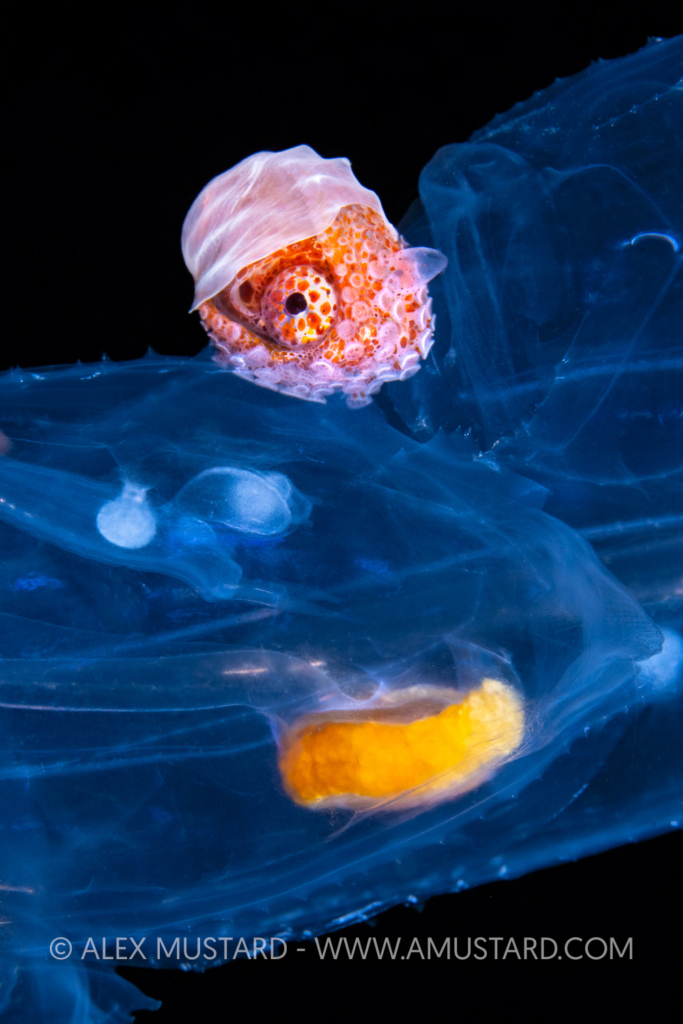“The largest migration on Earth happens every night across the ocean, when mesopelagic animals, that avoid the surface waters during the day, rise up to shallow depths,” explains Alex whose PhD was on zooplankton. “They avoid the sunlit upper layer in the day so that they are not eaten by predators, but under the cover of darkness they can safely ascend to feed in the rich shallow water. The plankton community is made up of both animals that live their whole lives in open water and the larval stages of species that we are familiar with from our regularly diving. Most species of marine animals, including fish and invertebrates have pelagic larval stages that usually look very different to the adult forms because of the necessity to be adapted for life in open water, creating striking underwater subjects.” These are the species we will be targeting on this workshop, which is timed to start at new moon. The group size is limited to 16, and you will be diving in groups of 4 with a guide on your own boat (and own downline for blackwater dives), with Alex (and Mike) joining different boats each day.